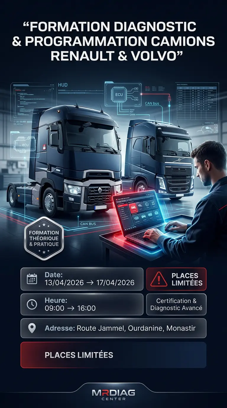 MRDIAG Center propose une formation professionnelle avancée en diagnostic et programmation des camions Renault et Volvo. Cette formation est conçue pour les techniciens , électriciens et professionnels du diagnostic souhaitant maîtriser les systèmes électroniques des poids lourds modernes.